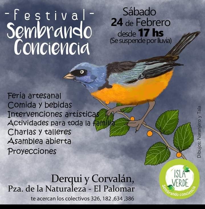 El sábado 24 se realizará el festival mensual “Sembrando conciencia”. Se desarrollará en la Plaza de la Naturaleza (Derqui y Corvalán) en Palomar, organizado por Isla Verde. Los colectivos 326, 182, 634 y 386 te acercan al evento. Comienza a las 17 hs., habrá música, comida, bebidas y una charla sobre Leyes Socioambientales.