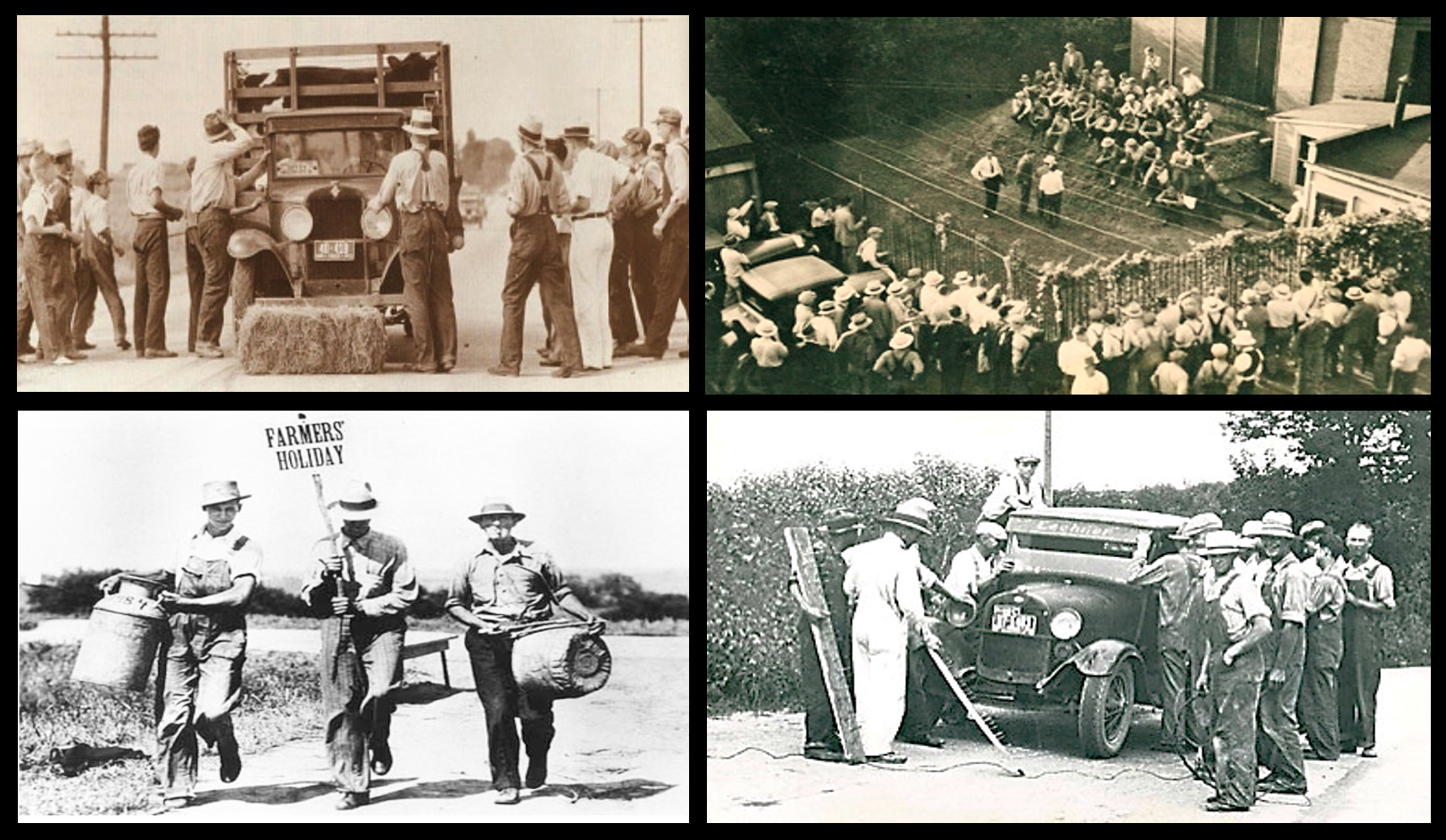 Hacia 1932, surge el movimiento de agricultores del Medio Oeste, “Granjeros’ Holiday Association” que fuera liderado por Milo Reno. Los agricultores decidieron tomar medidas extremas para garantizar que se cumplieran sus necesidades. Formaron piquetes y cortaron rutas. Se respaldaba la retención de productos agrícolas del mercado, creando en esencia unas “vacaciones laborales” para los agricultores. Instaban a todos los agricultores a declarar un «festivo» de la agricultura, con el lema «Quédate en casa, no compres nada, no vendas nada» y «Llamemos a unas vacaciones del granjero, mantengamos unas vacaciones. Comeremos nuestro trigo, nuestro jamón y nuestros huevos, y dejaremos que ellos coman su oro”.